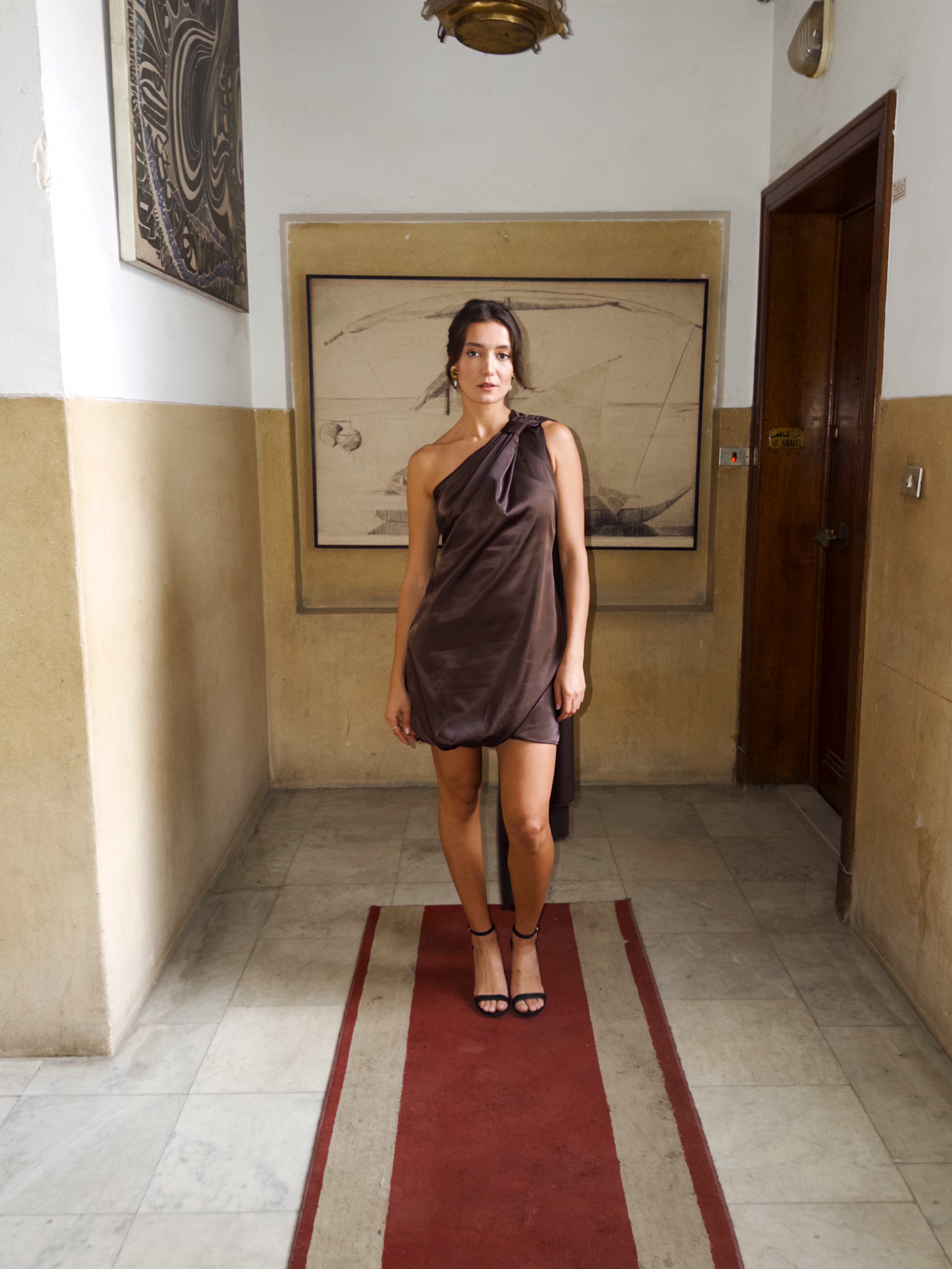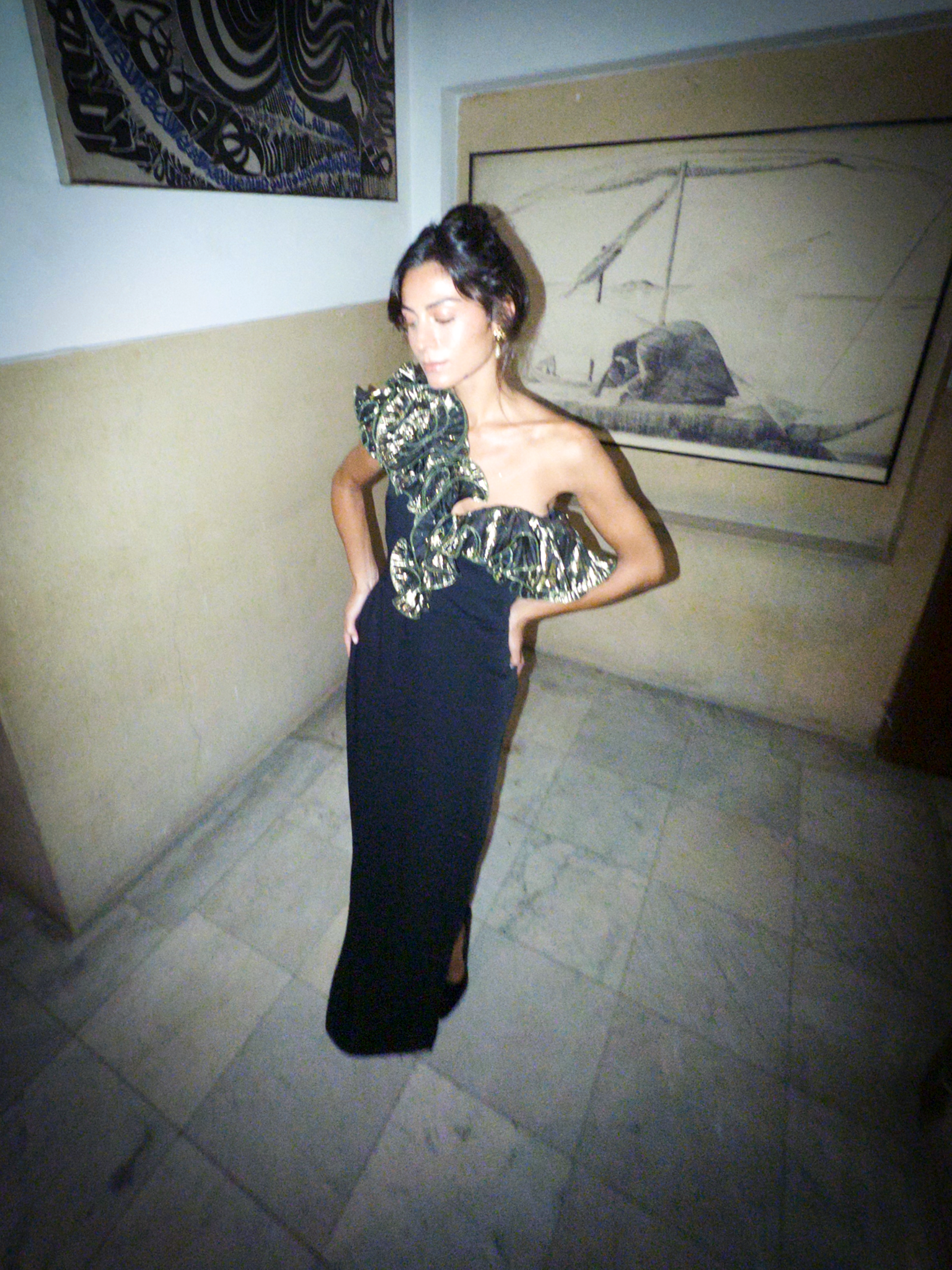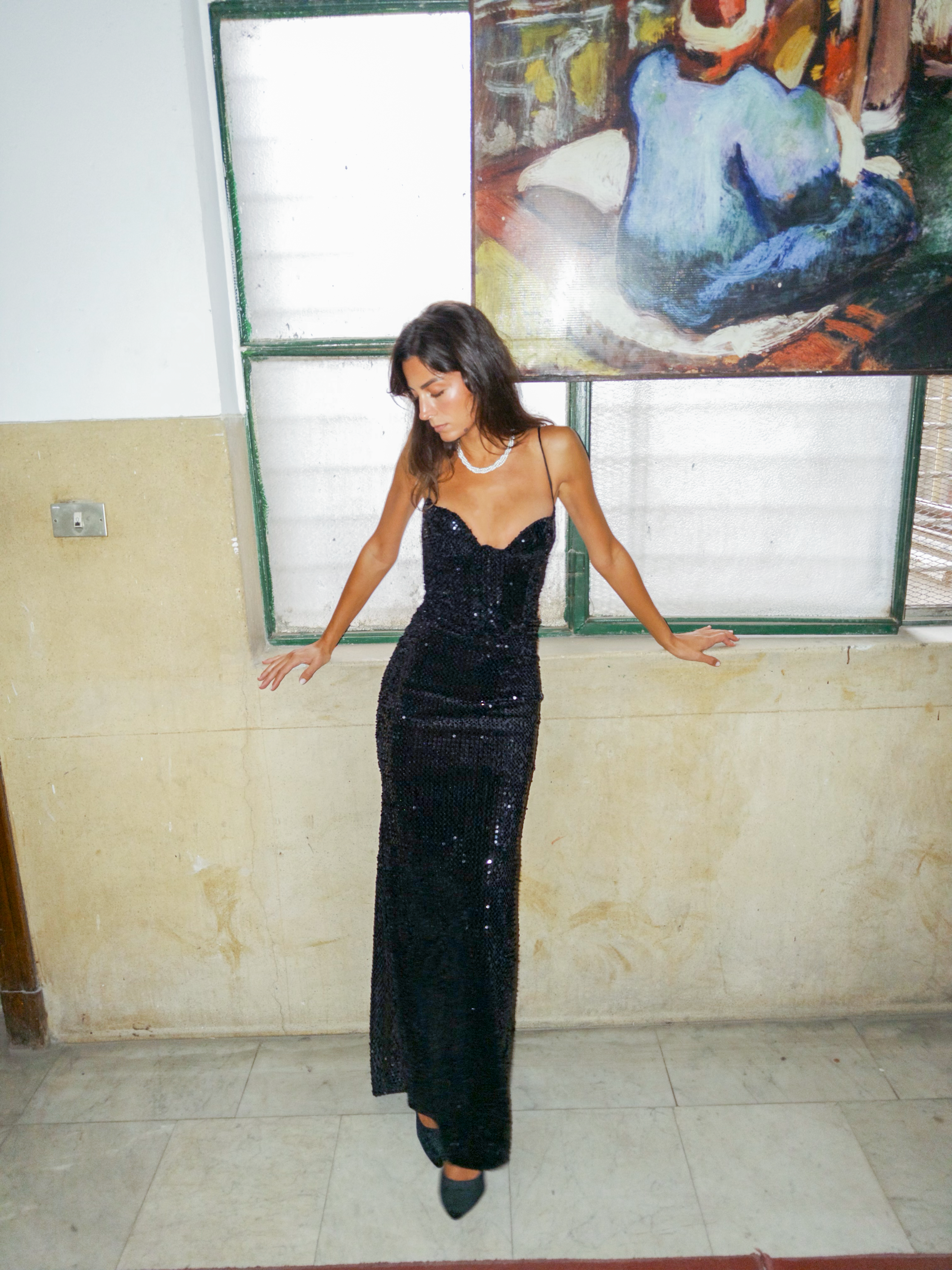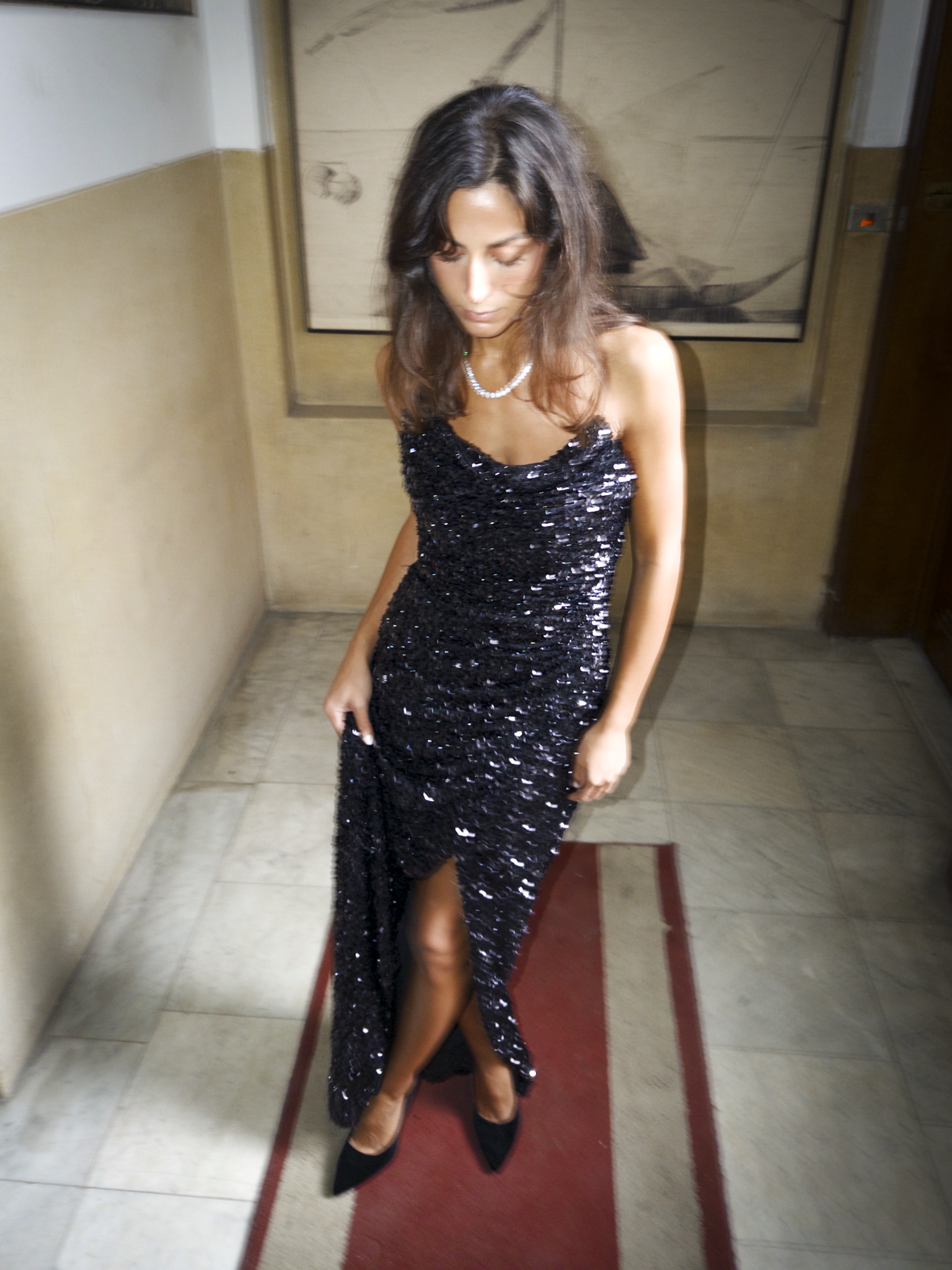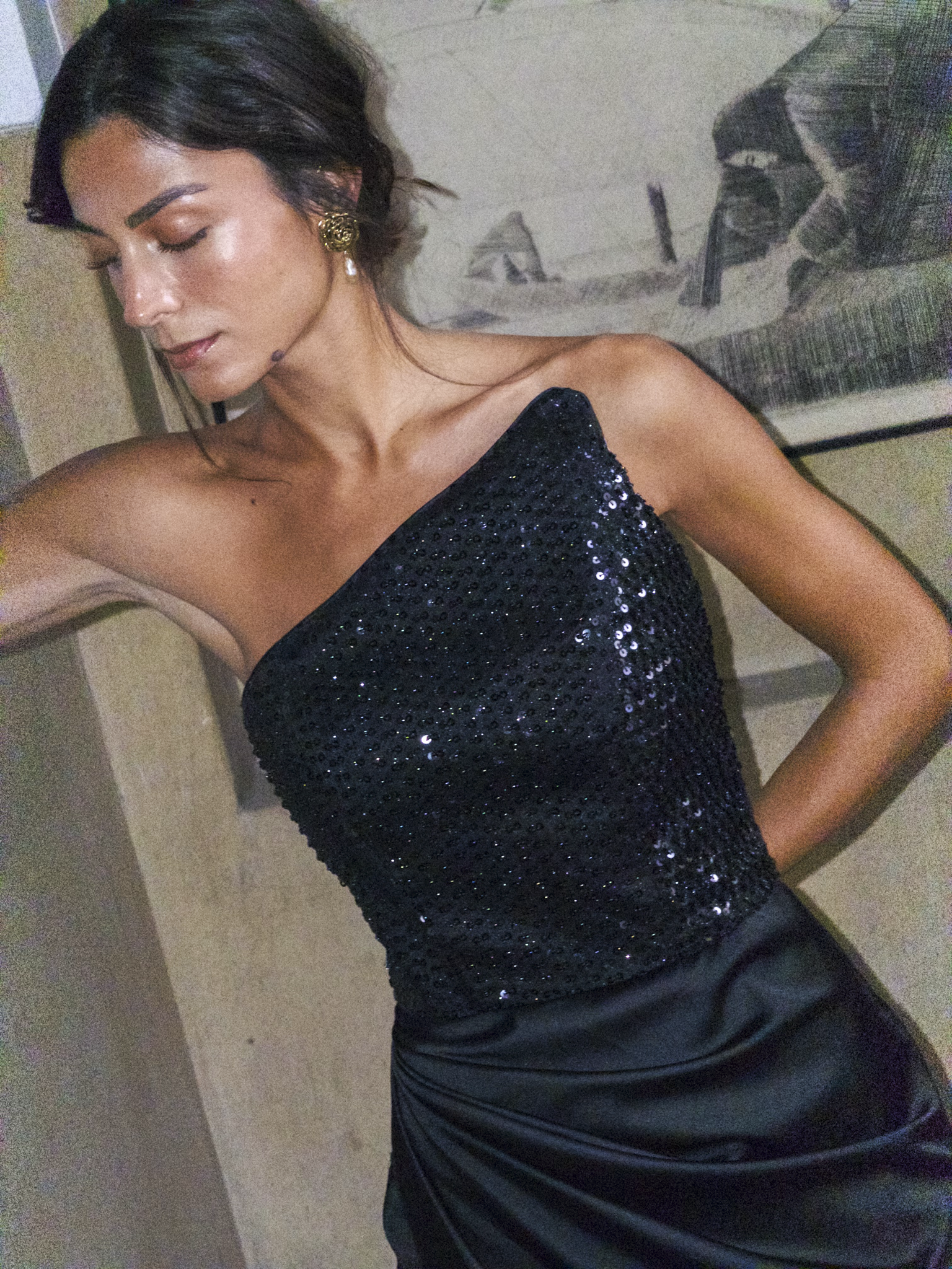 One shoulder Sequin Puffy Sleeved Dress in Black