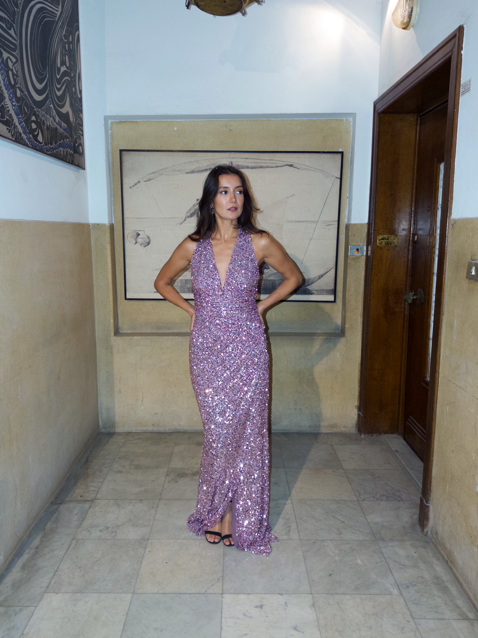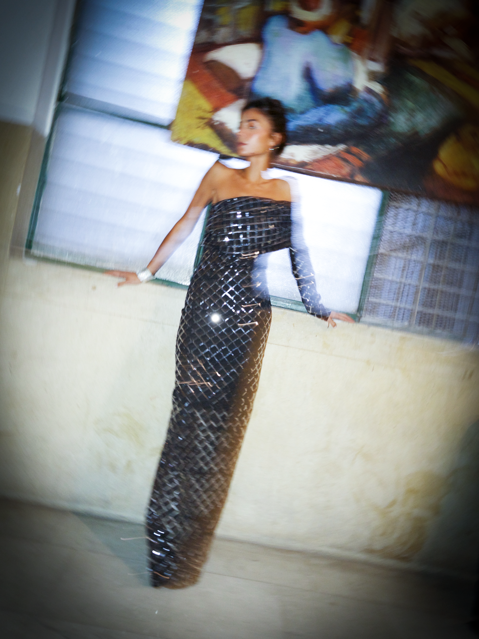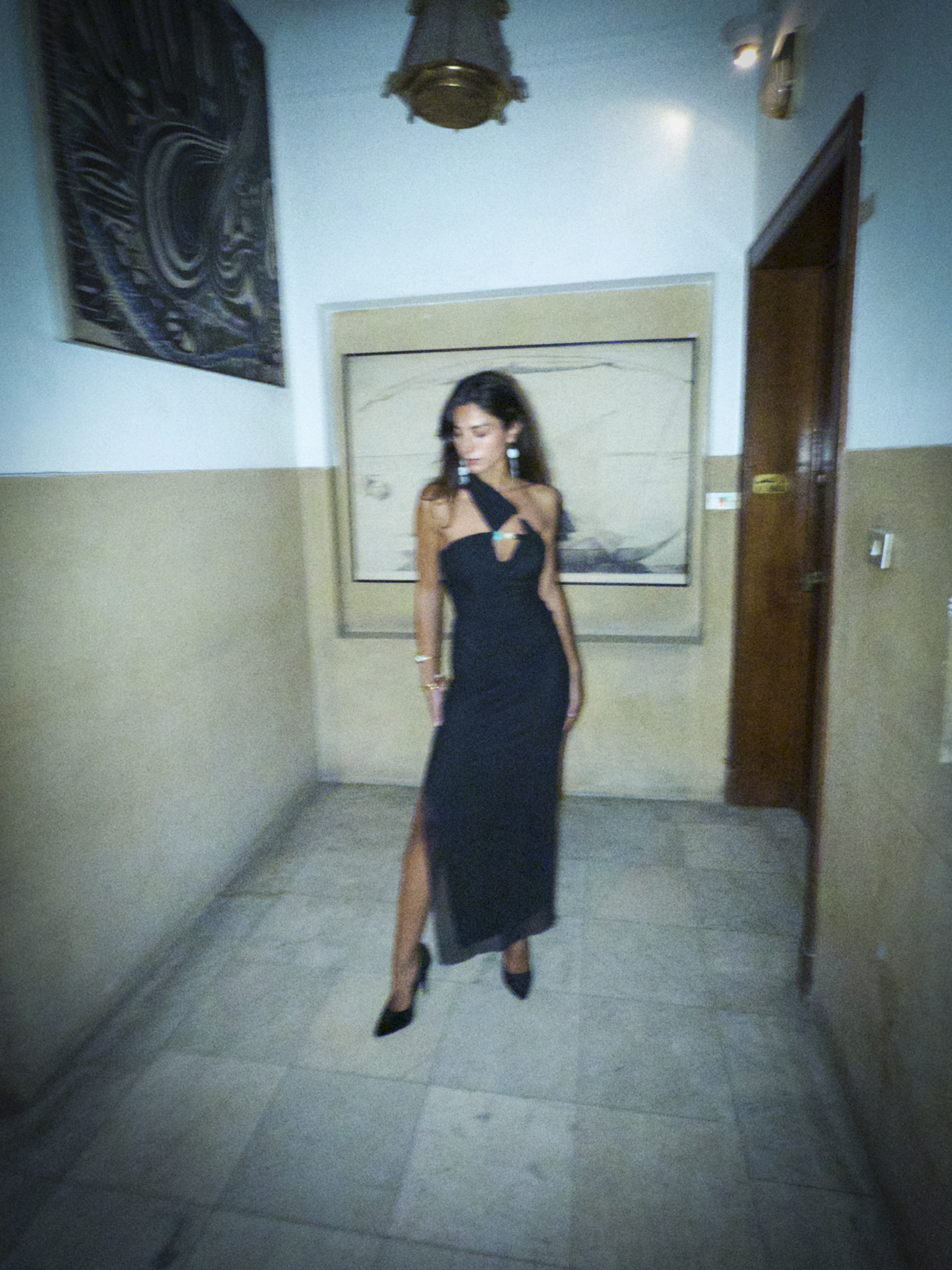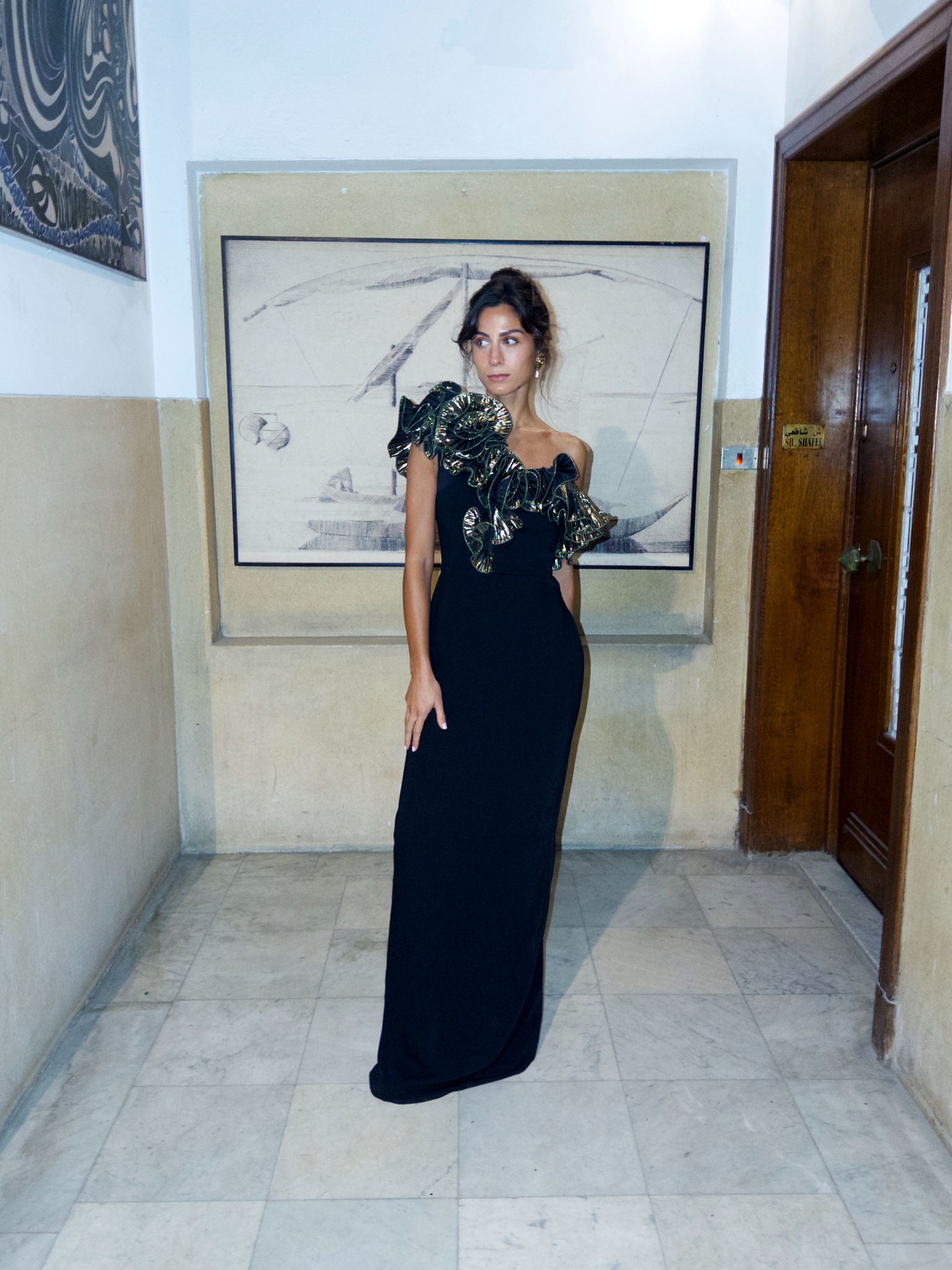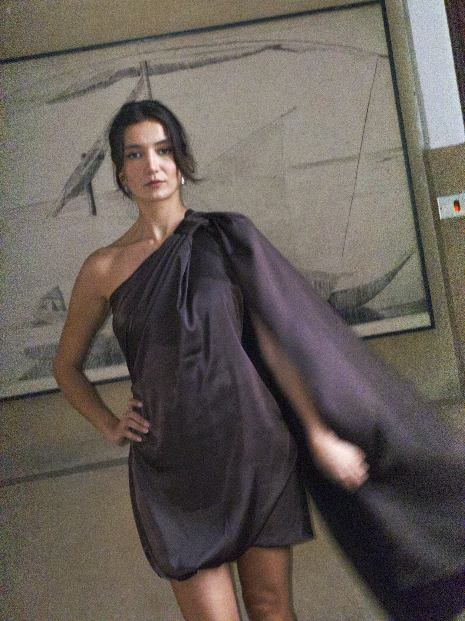 One shoulder Sequin Puffy Sleeved Dress in Black