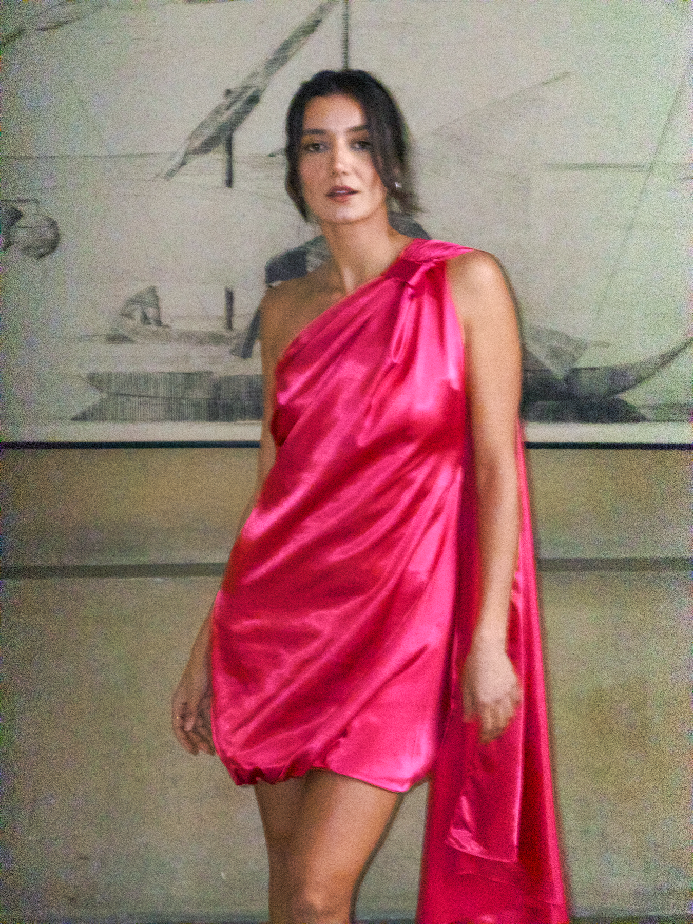 One Shoulder Short Satin Dress in Fuschia