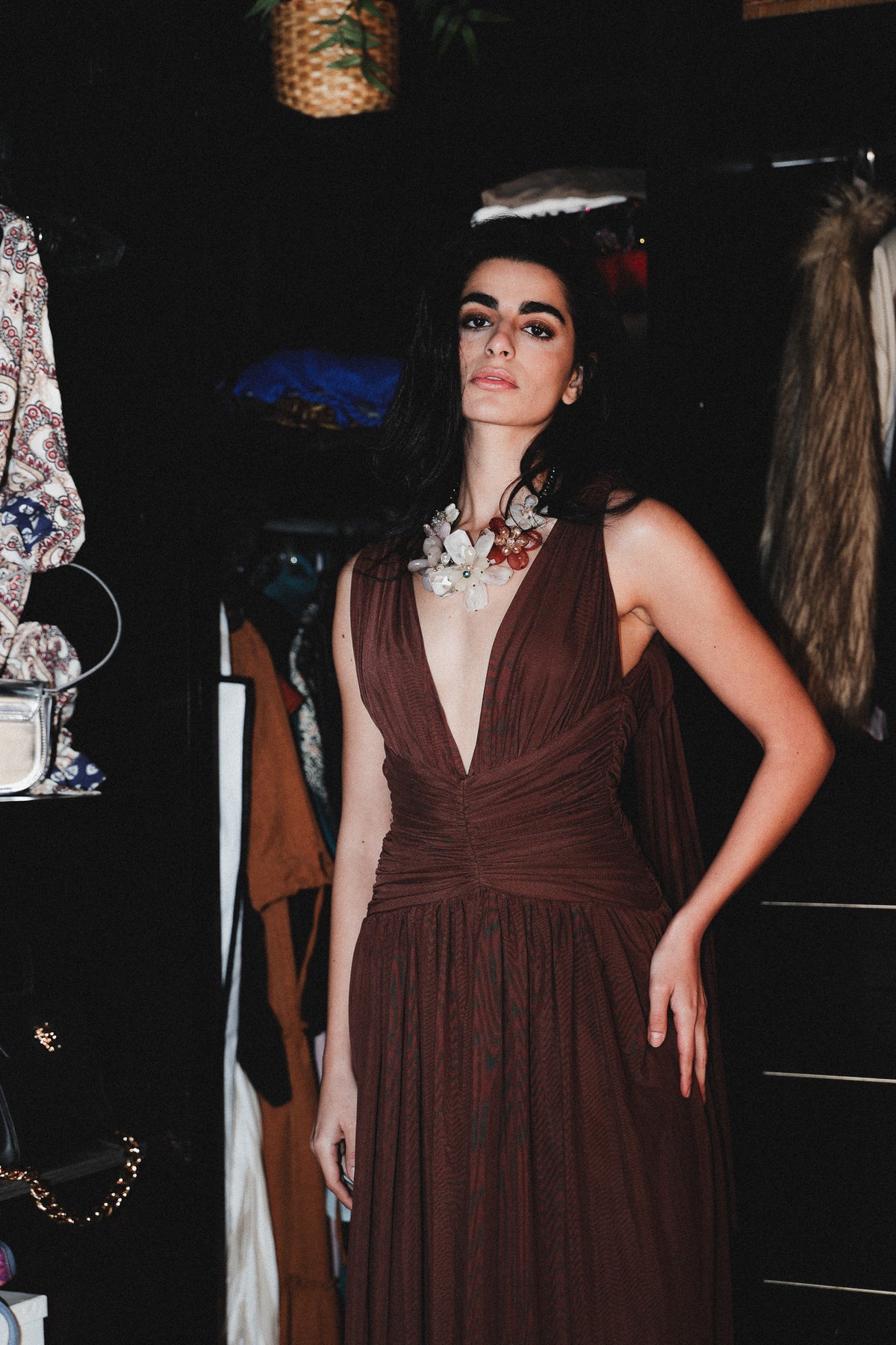 Backless tulle long dress in brown