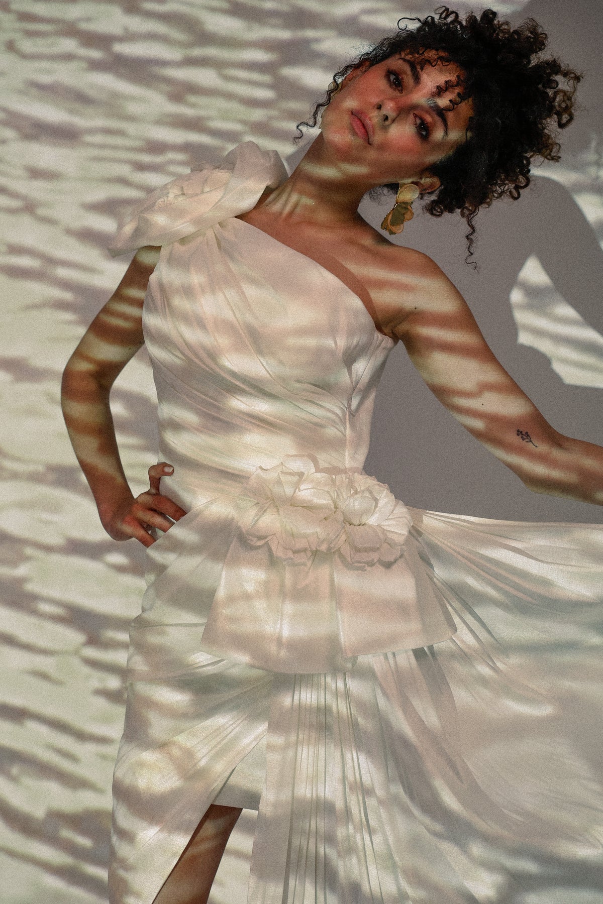 Flower short dress with one shoulder in white