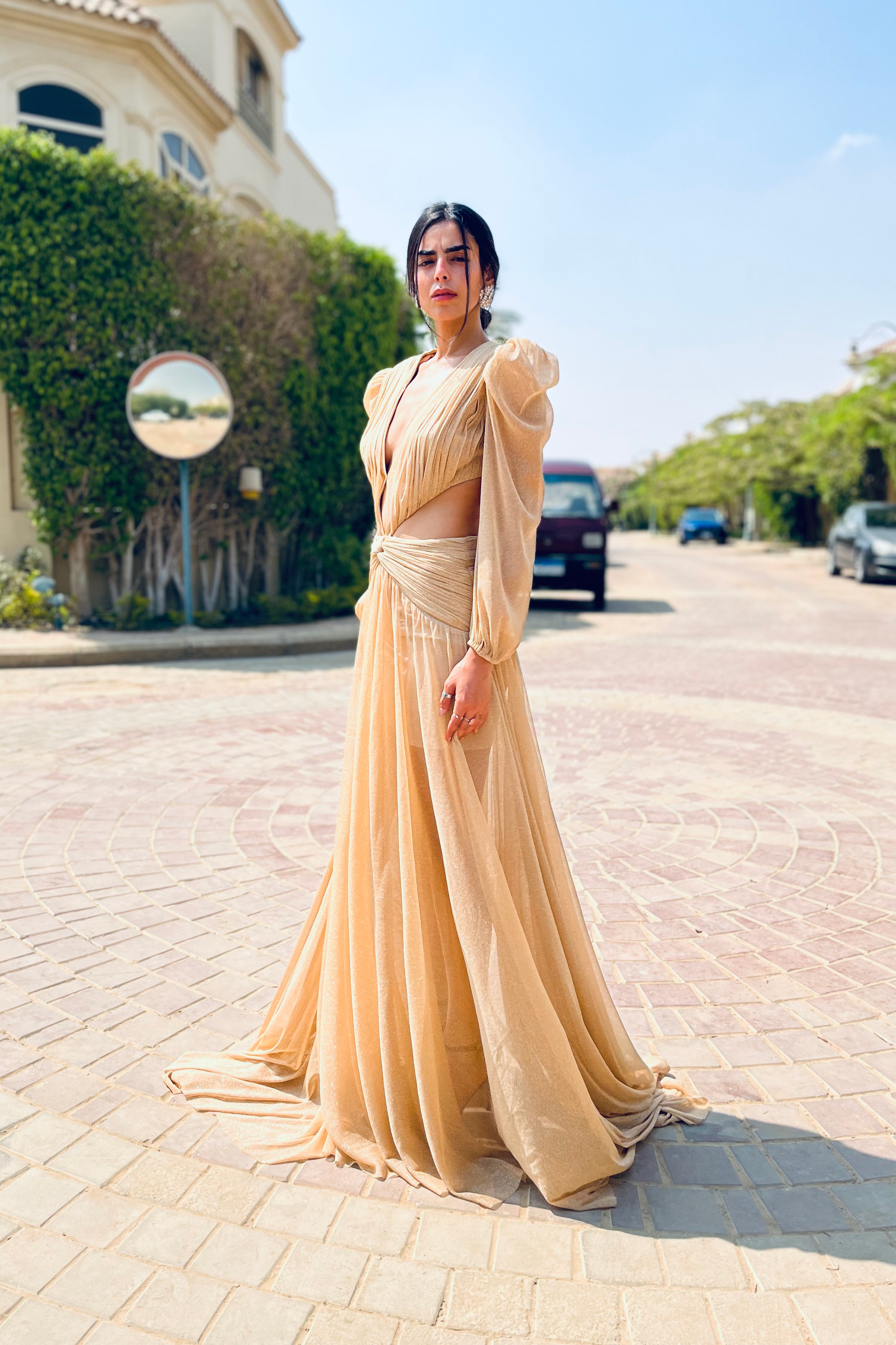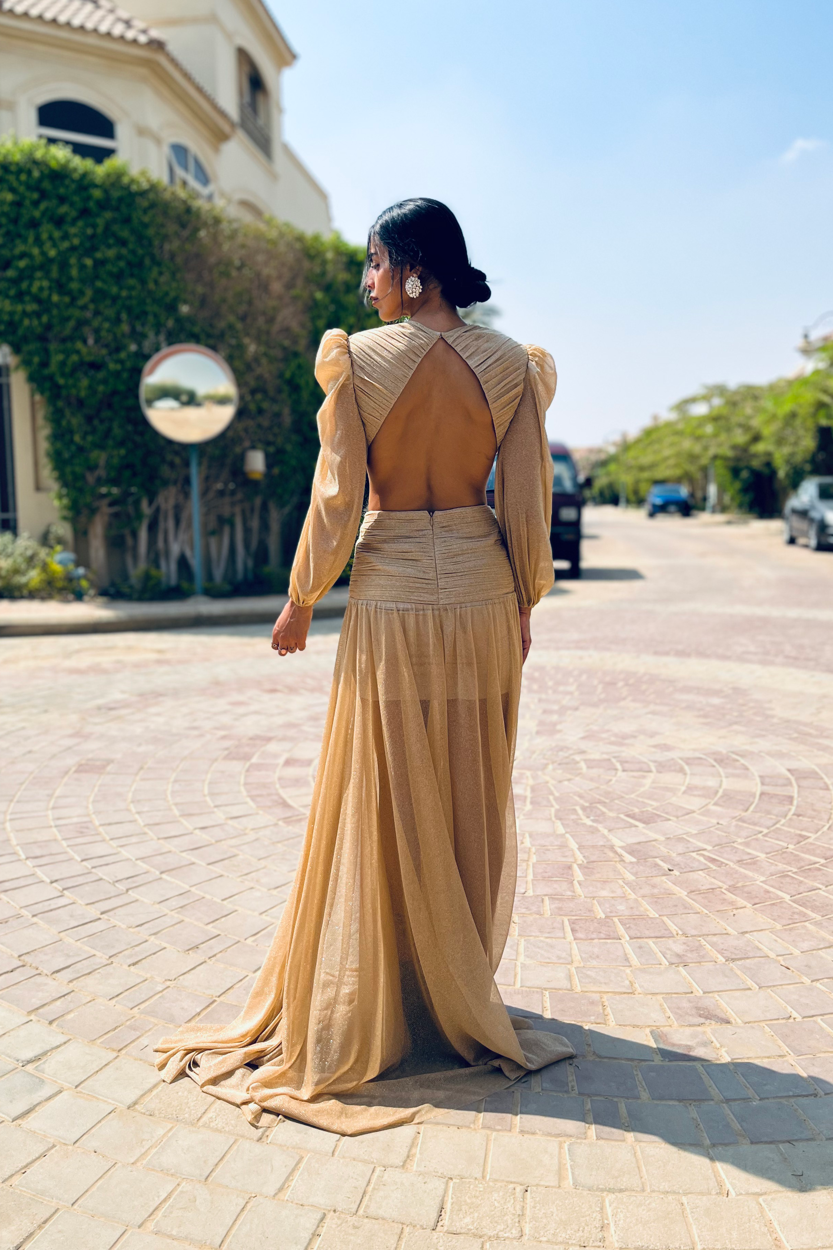 Long Sleeve Cutout Shimmery Dress in Muted Gold