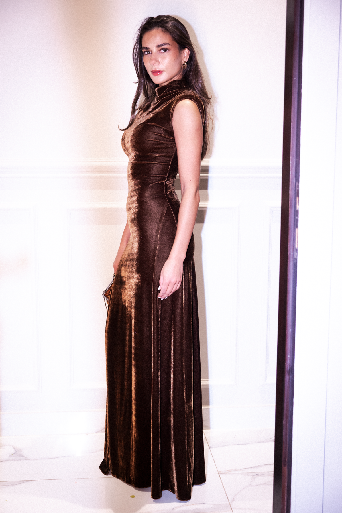 A floor length thick velvet dress with a side slit featuring a high neck collar and japonaise sleeves.
